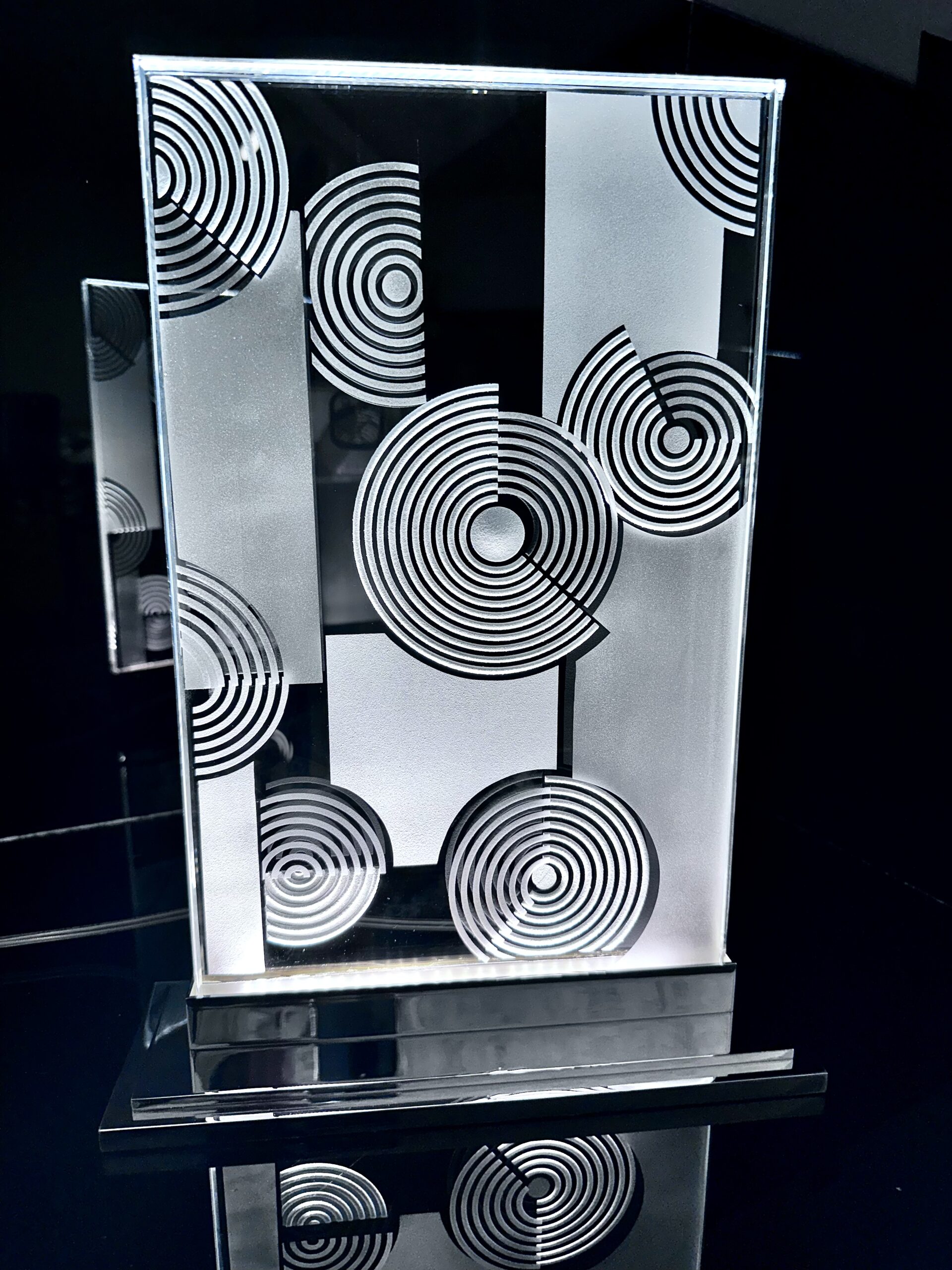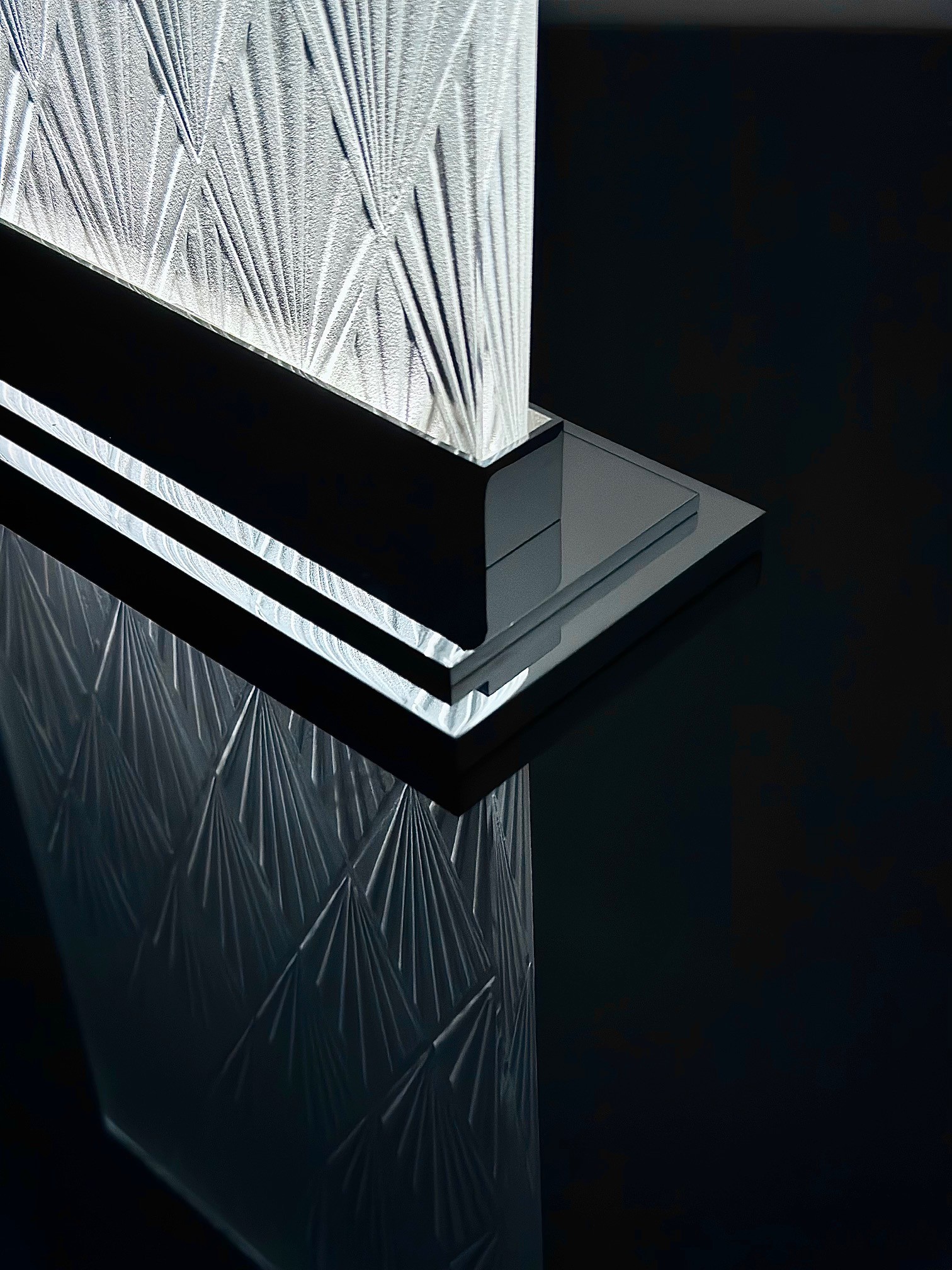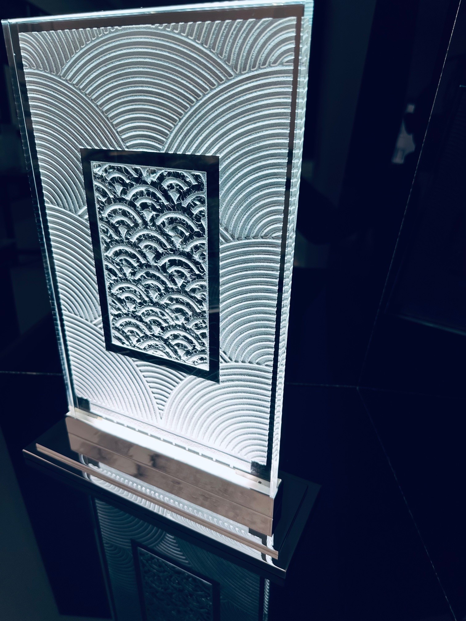 Lampe Delauney Une lampe inspirée des oeuvres de Claude et Sonia Delauney, notables par leurs formes circulaires abstraites. Collection Art Déco Lampes avec des motifs dans le style art déco. Des formes géométriques alliant élégance et modernité. Collection Blue Light Lampes modernes aux finitions minutieuses, avec des éléments en verre bleu. Collection Seigaiha Lampes au motif japonais ancestral revisité.