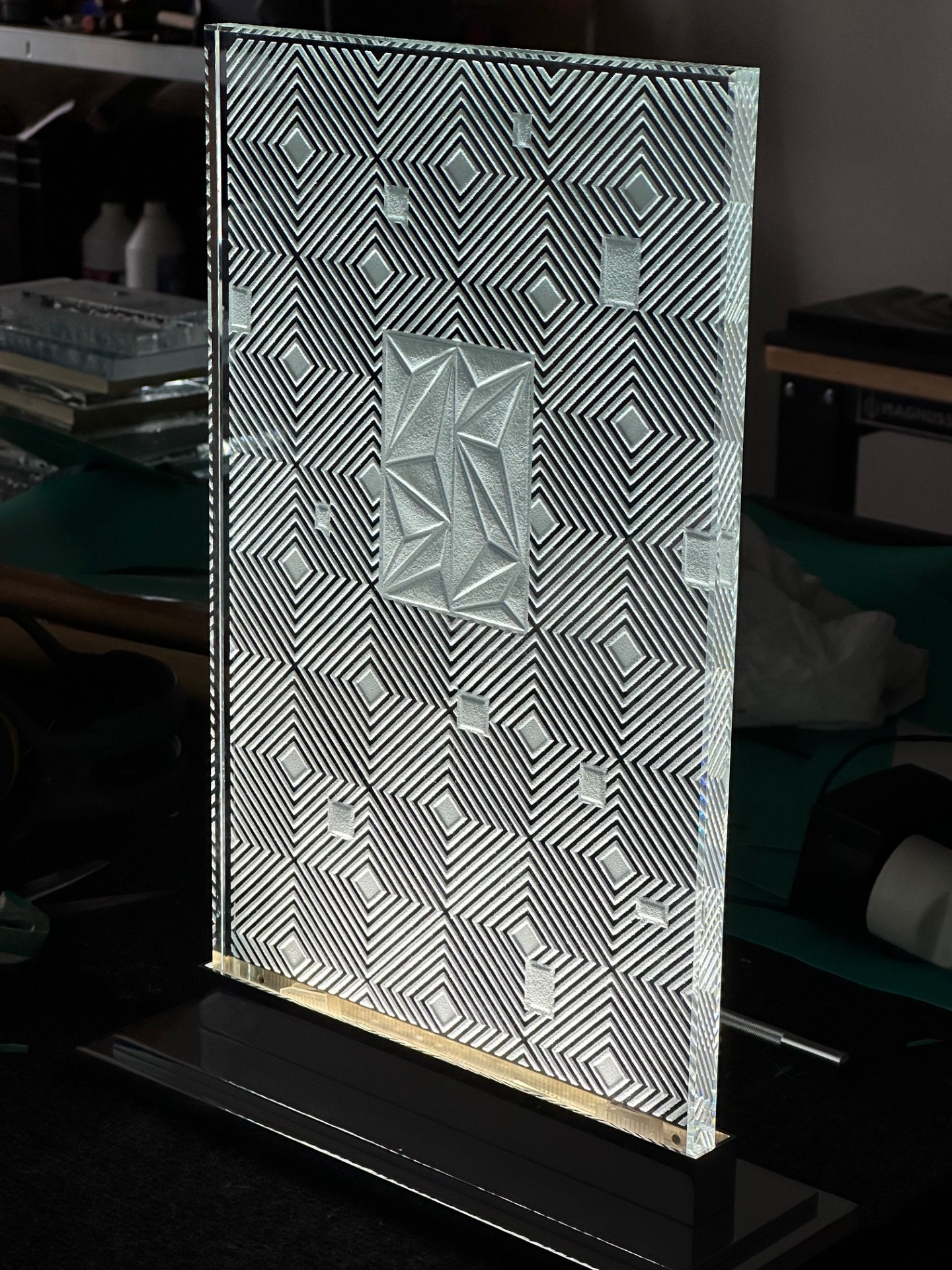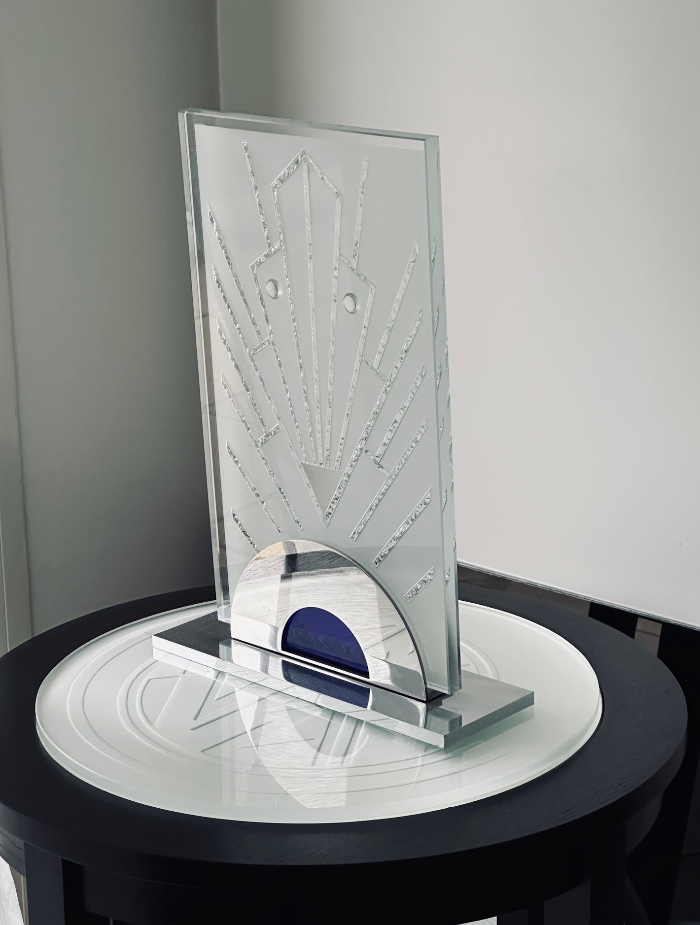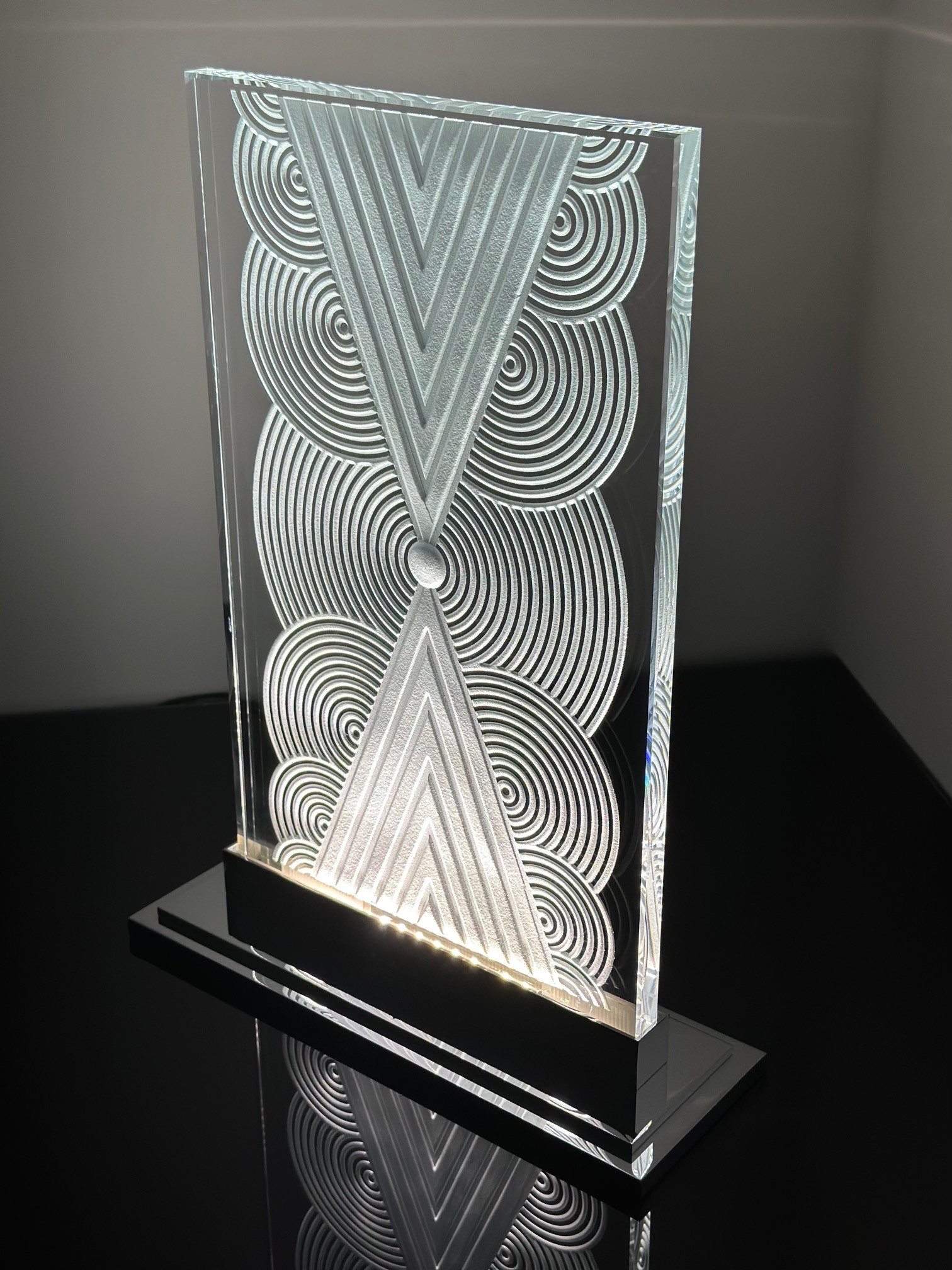 Lampe Delauney Une lampe inspirée des oeuvres de Claude et Sonia Delauney, notables par leurs formes circulaires abstraites. Collection Art Déco Lampes avec des motifs dans le style art déco. Des formes géométriques alliant élégance et modernité. Collection Blue Light Lampes modernes aux finitions minutieuses, avec des éléments en verre bleu. Collection Seigaiha Lampes au motif japonais ancestral revisité.