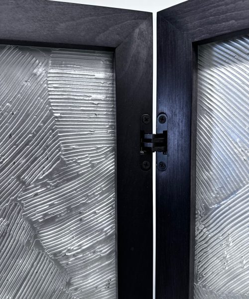 Le bois sombre et le verre texturé s’unissent pour créer une œuvre à la fois architecturale et spirituelle, sculptant l’espace par le jeu des reflets et des ombres.