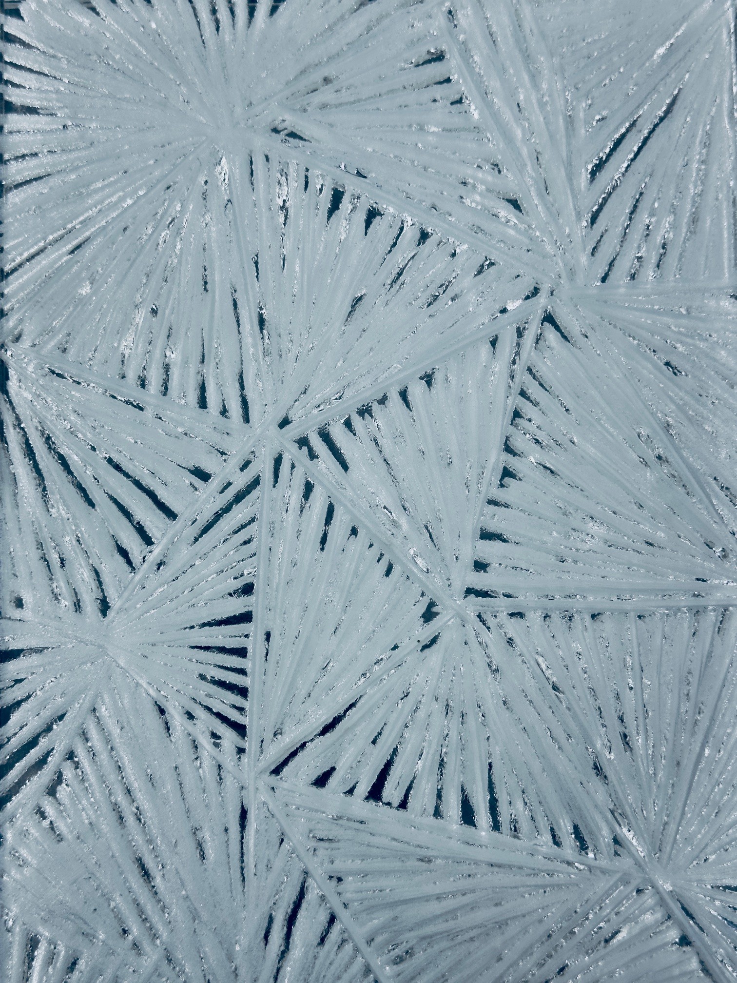Réalisé sur verre extra-blanc, ce motif est gravé en face arrière à la scie, formant une succession de triangles qui s’imbriquent les uns dans les autres.